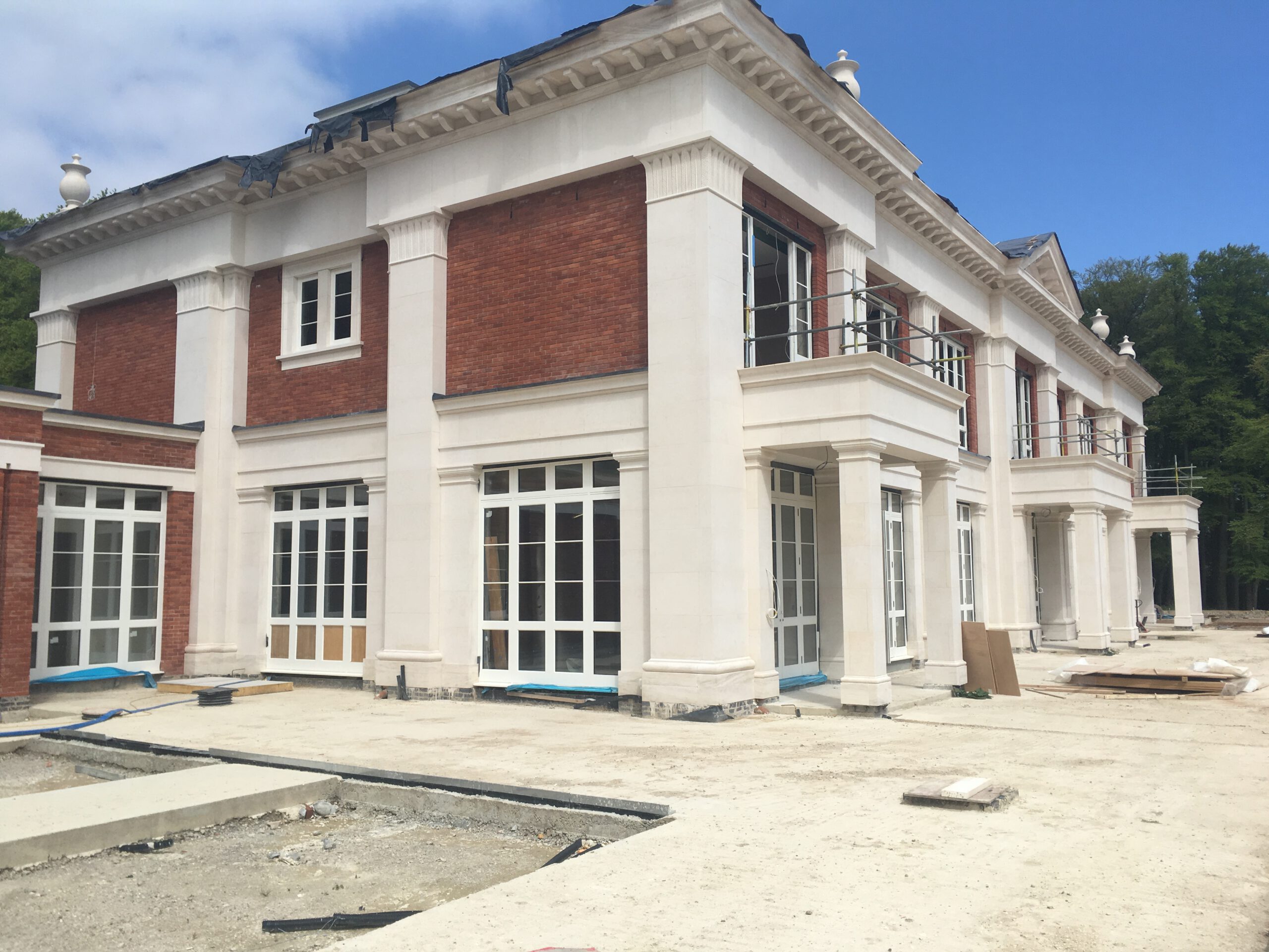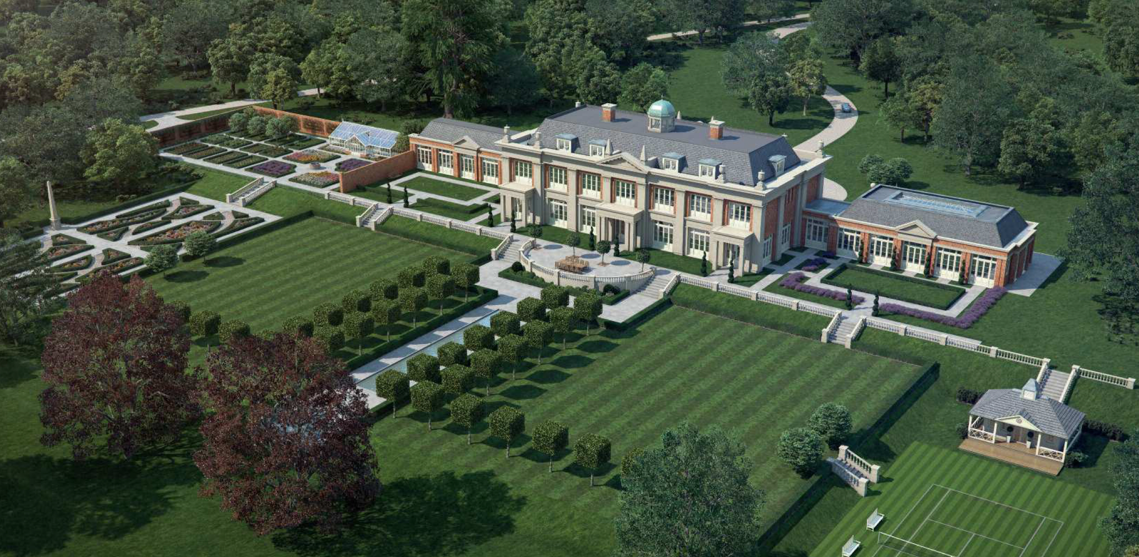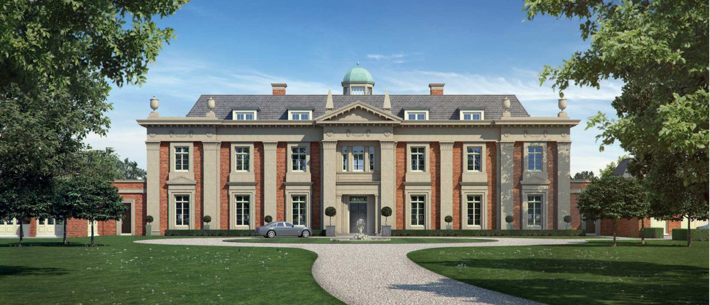 - Architectural Style: The design is a contemporary take on a traditional English country house, with a classical influence that includes features like a grand, raised balustrade, classical urns, and decorative stone garlands.